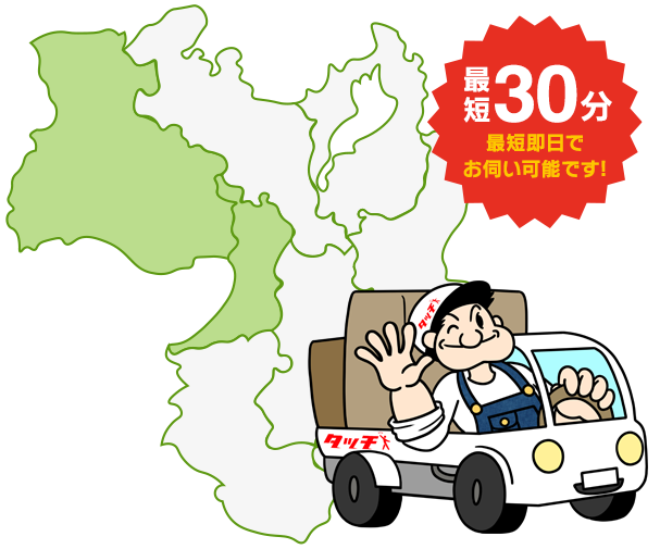 大阪府・兵庫県、京都府、和歌山県、奈良県、滋賀県、岡山県などの関西地方に対応しております。即日対応を心がけて活躍しておりますが、エリアによっては難しい場合もございますので、まずはご相談のご連絡お待ちしております。
