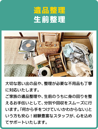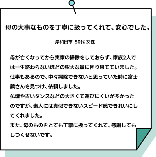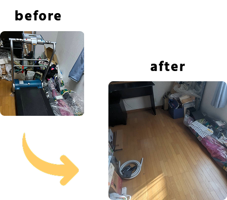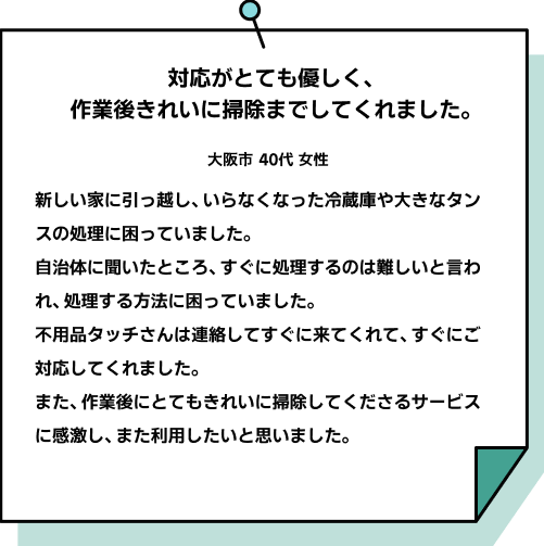 母が亡くなってから実家の掃除をしておらず、家族2人では一生終わらないほどの膨大な量に困り果てていました。仕事もあるので、中々掃除できないと思っていた時に不用品回収タッチさんを見つけ、依頼しました。仏壇や古いタンスなどの大きくて運びにくいが多かったのですが、素人には真似できないスピード感できれいにしてくれました。また、母のものをとても丁寧に扱ってくれて、感謝してもしつくせないです。