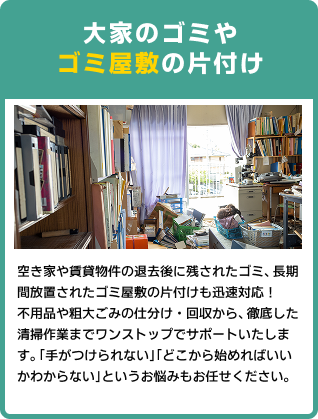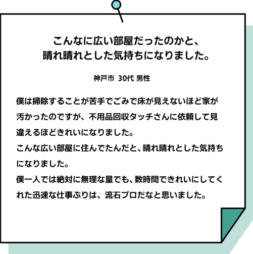 僕は掃除することが苦手でごみで床が見えないほど家が汚かったのですが、 不用品回収タッチさんに依頼して見違えるほどきれいになりました。こんな広い部屋に住んでたんだと、晴れ晴れとした気持ちになりました。僕一人では絶対に無理な量でも、数時間できれいにしてくれた迅速な仕事ぶりは、 流石プロだなと思いました。